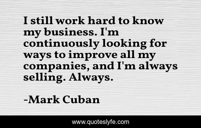 This page presents the quote "I still work hard to know my business. I'm continuously looking for ways to improve all my companies, and I'm always selling. Always.". Author of this quote is Mark Cuban. This quote is about looking, work, work hard,.
