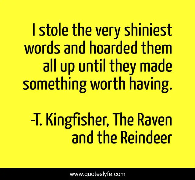 This page presents the quote "I stole the very shiniest words and hoarded them all up until they made something worth having.". Author of this quote is T. Kingfisher, The Raven and the Reindeer. This quote is about stolen, name, words, worthy,.