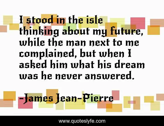 This page presents the quote "I stood in the isle thinking about my future, while the man next to me complained, but when I asked him what his dream was he never answered.". Author of this quote is James Jean-Pierre. This quote is about future, dream,.