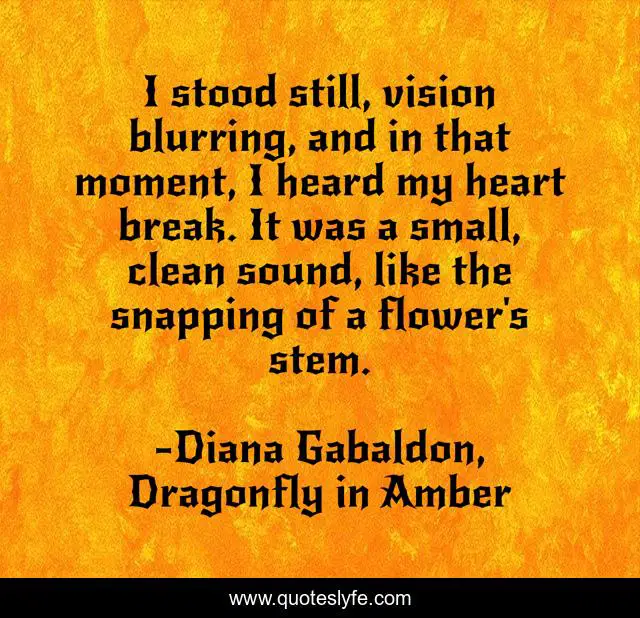 This page presents the quote "I stood still, vision blurring, and in that moment, I heard my heart break. It was a small, clean sound, like the snapping of a flower's stem.". Author of this quote is Diana Gabaldon, Dragonfly in Amber. This quote is about romance, time-travel, scotland, claire-fraser, historical-fiction,.