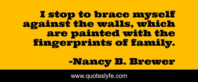 This page presents the quote "I stop to brace myself against the walls, which are painted with the fingerprints of family.". Author of this quote is Nancy B. Brewer. This quote is about civil-war, historical-romance, historical-fiction,.