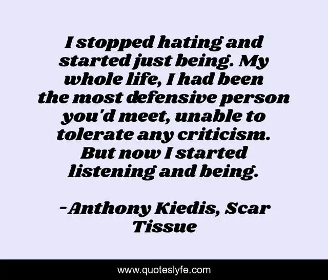 This page presents the quote "I stopped hating and started just being. My whole life, I had been the most defensive person you'd meet, unable to tolerate any criticism. But now I started listening and being.". Author of this quote is Anthony Kiedis, Scar Tissue. This quote is about being, defensiveness, listening,.