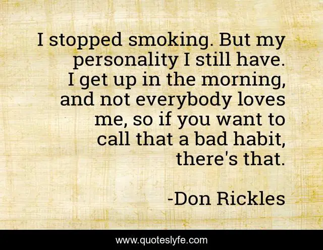 This page presents the quote "I stopped smoking. But my personality I still have. I get up in the morning, and not everybody loves me, so if you want to call that a bad habit, there's that.". Author of this quote is Don Rickles. This quote is about me, smoking, personality,.