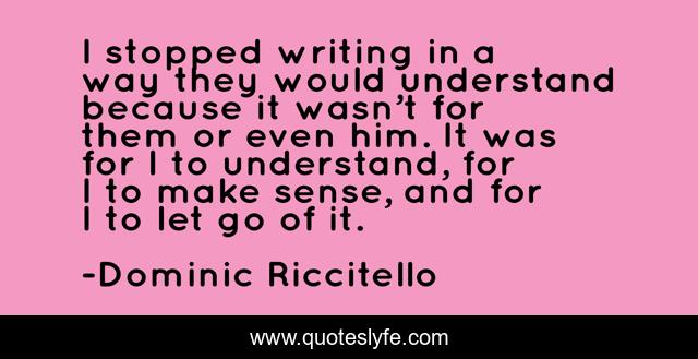 This page presents the quote "I stopped writing in a way they would understand because it wasn’t for them or even him. It was for I to understand, for I to make sense, and for I to let go of it.". Author of this quote is Dominic Riccitello. This quote is about life, truth, relationship, quote, experience, understanding, words, opinion, writing,.
