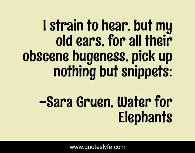 This page presents the quote "I strain to hear, but my old ears, for all their obscene hugeness, pick up nothing but snippets:". Author of this quote is Sara Gruen, Water for Elephants. .