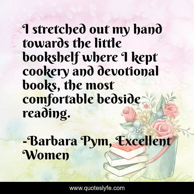 This page presents the quote "I stretched out my hand towards the little bookshelf where I kept cookery and devotional books, the most comfortable bedside reading.". Author of this quote is Barbara Pym, Excellent Women. .