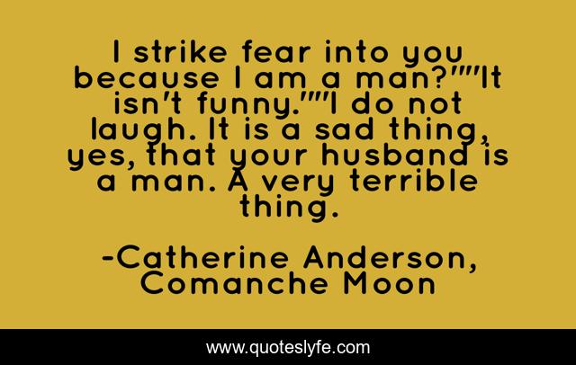 This page presents the quote "I strike fear into you because I am a man?""It isn't funny.""I do not laugh. It is a sad thing, yes, that your husband is a man. A very terrible thing.". Author of this quote is Catherine Anderson, Comanche Moon. This quote is about funny, comedy, hunter-loretta,.