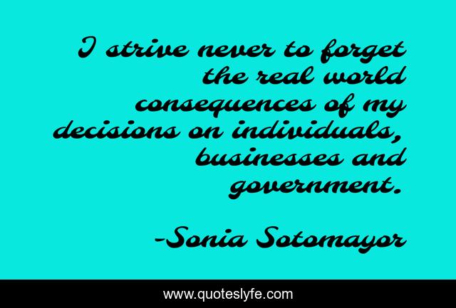 This page presents the quote "I strive never to forget the real world consequences of my decisions on individuals, businesses and government.". Author of this quote is Sonia Sotomayor. This quote is about world, decisions,.