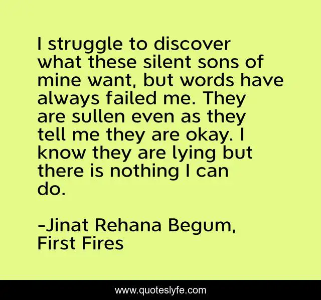 This page presents the quote "I struggle to discover what these silent sons of mine want, but words have always failed me. They are sullen even as they tell me they are okay. I know they are lying but there is nothing I can do.". Author of this quote is Jinat Rehana Begum, First Fires. This quote is about parenthood, motherhood, sons, children, words,.