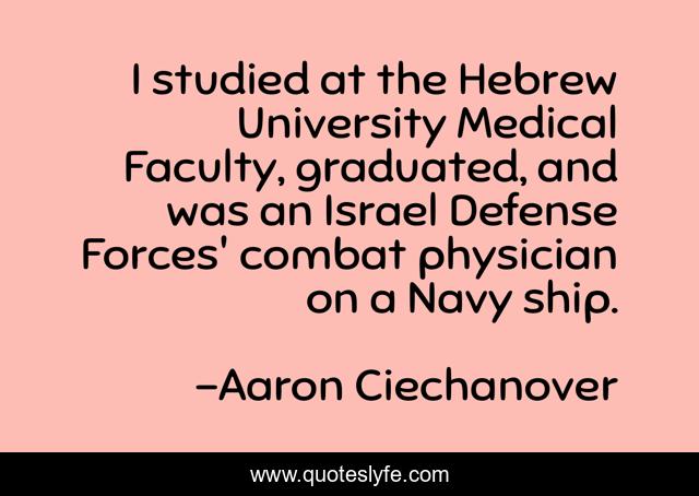 This page presents the quote "I studied at the Hebrew University Medical Faculty, graduated, and was an Israel Defense Forces' combat physician on a Navy ship.". Author of this quote is Aaron Ciechanover. This quote is about navy, physician, ship,.
