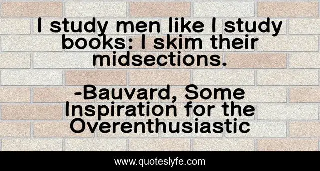 This page presents the quote "I study men like I study books: I skim their midsections.". Author of this quote is Bauvard, Some Inspiration for the Overenthusiastic. This quote is about funny, humor, weight, character, books, comedy,.