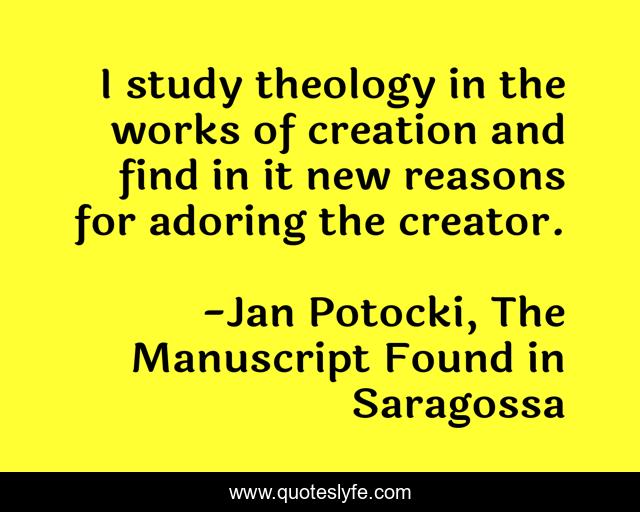 This page presents the quote "I study theology in the works of creation and find in it new reasons for adoring the creator.". Author of this quote is Jan Potocki, The Manuscript Found in Saragossa. This quote is about faith, creation, theology,.