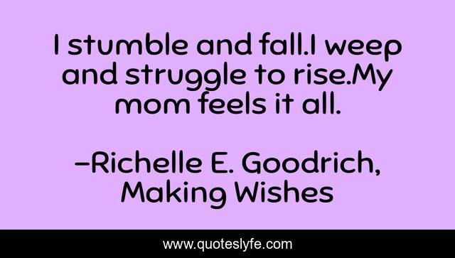 This page presents the quote "I stumble and fall.I weep and struggle to rise.My mom feels it all.". Author of this quote is Richelle E. Goodrich, Making Wishes. This quote is about empathy, mom, motherhood, moms, richelle-e-goodrich, poetry, feelings, sympathy, mother-s-love,.