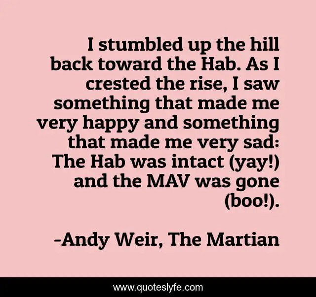 This page presents the quote "I stumbled up the hill back toward the Hab. As I crested the rise, I saw something that made me very happy and something that made me very sad: The Hab was intact (yay!) and the MAV was gone (boo!).". Author of this quote is Andy Weir, The Martian. This quote is about mars, humor, space,.