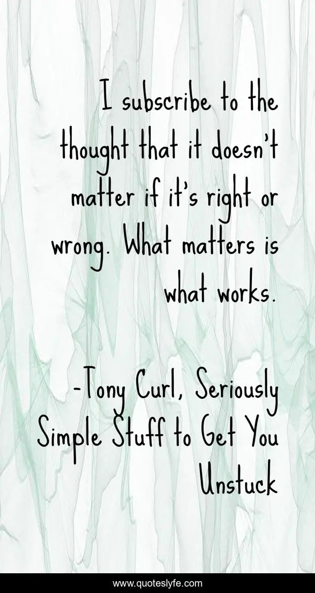 This page presents the quote "I subscribe to the thought that it doesn’t matter if it’s right or wrong. What matters is what works.". Author of this quote is Tony Curl, Seriously Simple Stuff to Get You Unstuck. This quote is about goal-getting, positive, motivational, confidence, optimistic, inspirational, life-changing, enthusiasm, goal-setting,.