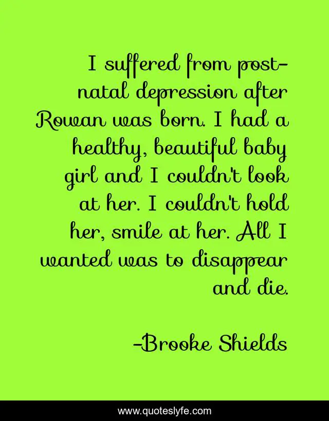 This page presents the quote "I suffered from post-natal depression after Rowan was born. I had a healthy, beautiful baby girl and I couldn't look at her. I couldn't hold her, smile at her. All I wanted was to disappear and die.". Author of this quote is Brooke Shields. This quote is about beautiful, baby, depression,.