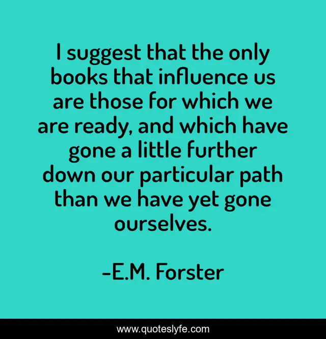 This page presents the quote "I suggest that the only books that influence us are those for which we are ready, and which have gone a little further down our particular path than we have yet gone ourselves.". Author of this quote is E.M. Forster. This quote is about self-discovery, books, literature,.