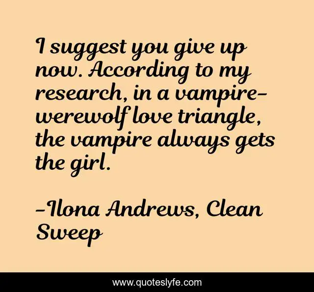 This page presents the quote "I suggest you give up now. According to my research, in a vampire-werewolf love triangle, the vampire always gets the girl.". Author of this quote is Ilona Andrews, Clean Sweep. This quote is about humor, love, vampire, affection, werewolves,.