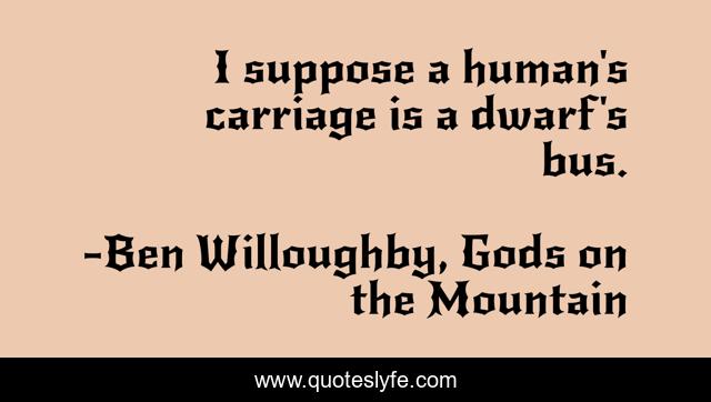 This page presents the quote "I suppose a human's carriage is a dwarf's bus.". Author of this quote is Ben Willoughby, Gods on the Mountain. This quote is about dwarf, bus, humans, carriage, dwarfs, human,.