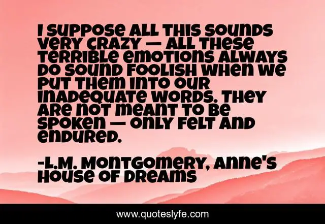 This page presents the quote "I suppose all this sounds very crazy — all these terrible emotions always do sound foolish when we put them into our inadequate words. They are not meant to be spoken — only felt and endured.". Author of this quote is L.M. Montgomery, Anne's House of Dreams. .