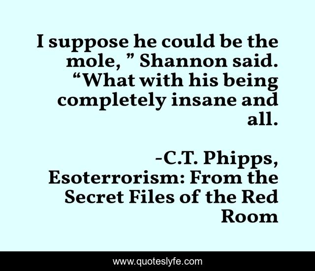 This page presents the quote "I suppose he could be the mole, ” Shannon said. “What with his being completely insane and all.". Author of this quote is C.T. Phipps, Esoterrorism: From the Secret Files of the Red Room. This quote is about paranormal-fantasy, esoterrorism, urban-fantasy, shannon-o-reilly,.