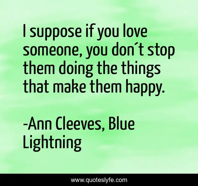 This page presents the quote "I suppose if you love someone, you don´t stop them doing the things that make them happy.". Author of this quote is Ann Cleeves, Blue Lightning. This quote is about love, happiness, affection,.