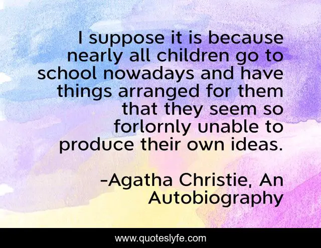 This page presents the quote "I suppose it is because nearly all children go to school nowadays and have things arranged for them that they seem so forlornly unable to produce their own ideas.". Author of this quote is Agatha Christie, An Autobiography. This quote is about homeschooling, homeschool, education, learning,.