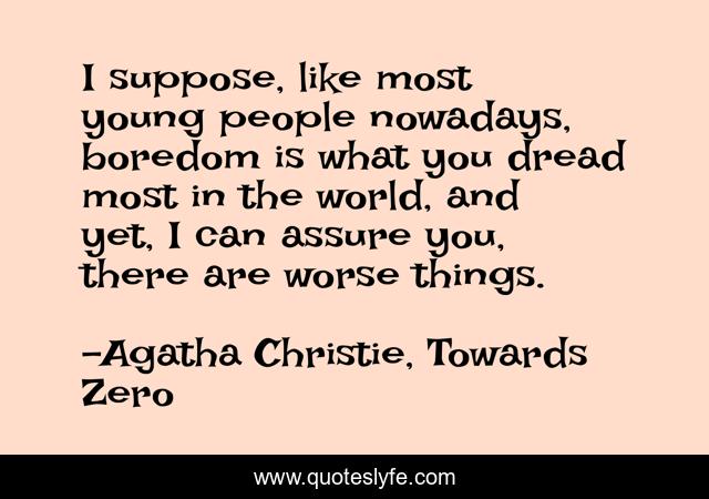 This page presents the quote "I suppose, like most young people nowadays, boredom is what you dread most in the world, and yet, I can assure you, there are worse things.". Author of this quote is Agatha Christie, Towards Zero. This quote is about youth, boredom,.
