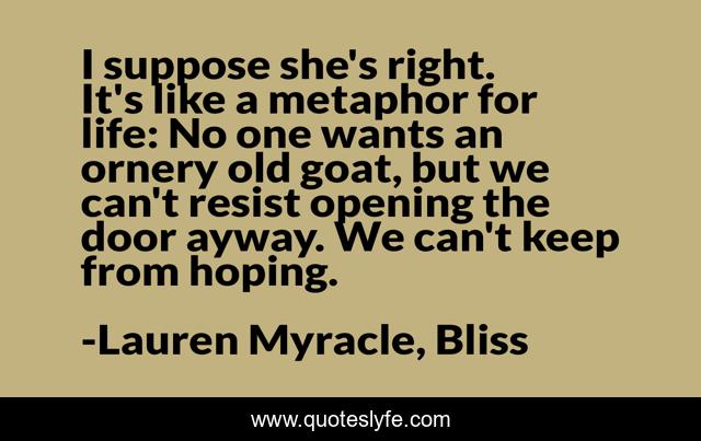 This page presents the quote "I suppose she's right. It's like a metaphor for life: No one wants an ornery old goat, but we can't resist opening the door ayway. We can't keep from hoping.". Author of this quote is Lauren Myracle, Bliss. .