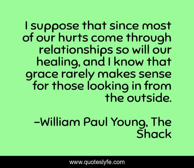 This page presents the quote "I suppose that since most of our hurts come through relationships so will our healing, and I know that grace rarely makes sense for those looking in from the outside.". Author of this quote is William Paul Young, The Shack. This quote is about relationships, pain, healing,.
