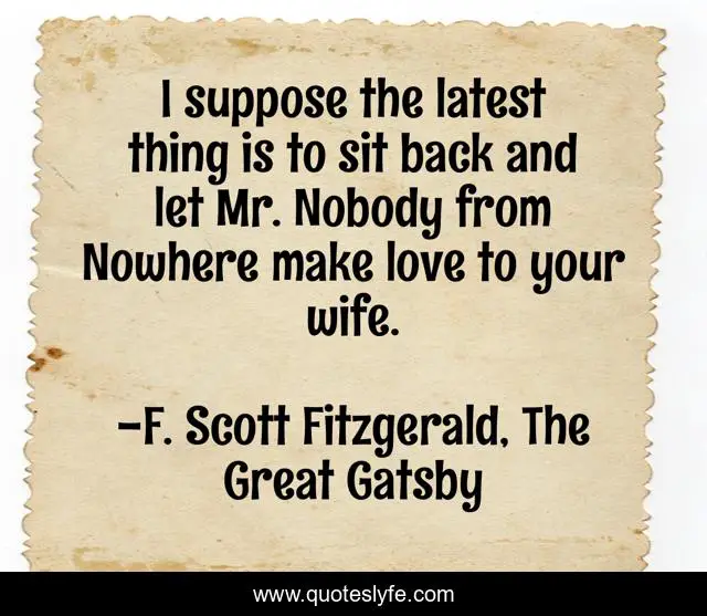 This page presents the quote "I suppose the latest thing is to sit back and let Mr. Nobody from Nowhere make love to your wife.". Author of this quote is F. Scott Fitzgerald, The Great Gatsby. This quote is about funny, love, sarcasm, gatsby, tom, comedy, affection,.