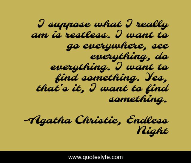 This page presents the quote "I suppose what I really am is restless. I want to go everywhere, see everything, do everything. I want to find something. Yes, that's it, I want to find something.". Author of this quote is Agatha Christie, Endless Night. This quote is about meaning-of-life, purpose, restless,.