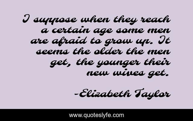 This page presents the quote "I suppose when they reach a certain age some men are afraid to grow up. It seems the older the men get, the younger their new wives get.". Author of this quote is Elizabeth Taylor. This quote is about grow up, grow, men,.
