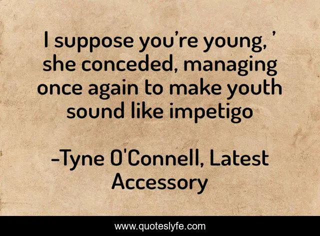 This page presents the quote "I suppose you’re young, ’ she conceded, managing once again to make youth sound like impetigo". Author of this quote is Tyne O'Connell, Latest Accessory. This quote is about youth, humour,.