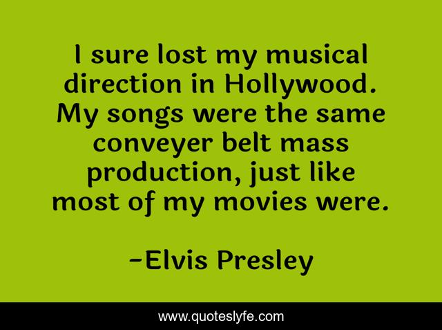 This page presents the quote "I sure lost my musical direction in Hollywood. My songs were the same conveyer belt mass production, just like most of my movies were.". Author of this quote is Elvis Presley. This quote is about direction, hollywood, lost,.