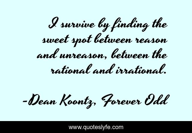 This page presents the quote "I survive by finding the sweet spot between reason and unreason, between the rational and irrational.". Author of this quote is Dean Koontz, Forever Odd. This quote is about reason, balance, irrational, rational, unreason,.