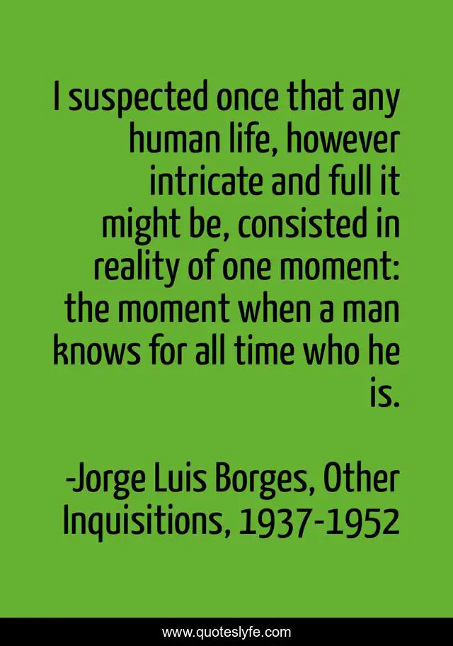 This page presents the quote "I suspected once that any human life, however intricate and full it might be, consisted in reality of one moment: the moment when a man knows for all time who he is.". Author of this quote is Jorge Luis Borges, Other Inquisitions, 1937-1952. This quote is about self, growth, reality,.