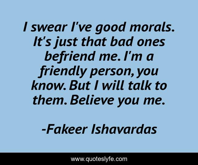 "Fakeer Ishavardas Quotes." Quoteslyfe.com, 2025. Mon. 08 Dec. 2025. <https://www.quoteslyfe.com/quote/I-swear-I-ve-good-morals-It-210489>.