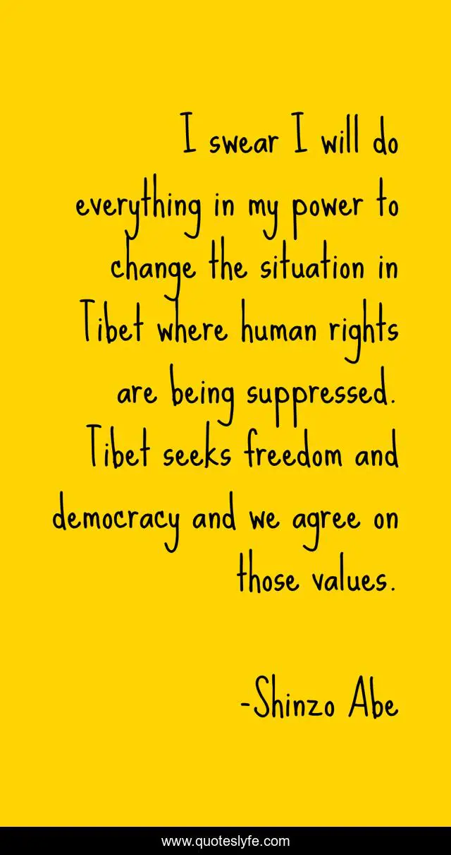 This page presents the quote "I swear I will do everything in my power to change the situation in Tibet where human rights are being suppressed. Tibet seeks freedom and democracy and we agree on those values.". Author of this quote is Shinzo Abe. This quote is about change, power, democracy,.