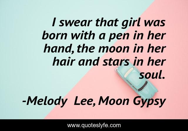 This page presents the quote "I swear that girl was born with a pen in her hand, the moon in her hair and stars in her soul.". Author of this quote is Melody Lee, Moon Gypsy. This quote is about poetry, soul, quotes, stars, poems, writing, moon,.