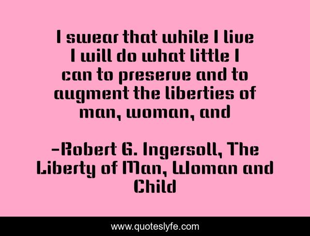 This page presents the quote "I swear that while I live I will do what little I can to preserve and to augment the liberties of man, woman, and". Author of this quote is Robert G. Ingersoll, The Liberty of Man, Woman and Child. This quote is about mercy, equality, honesty, rights, justice, freedom, liberty, virtue,.