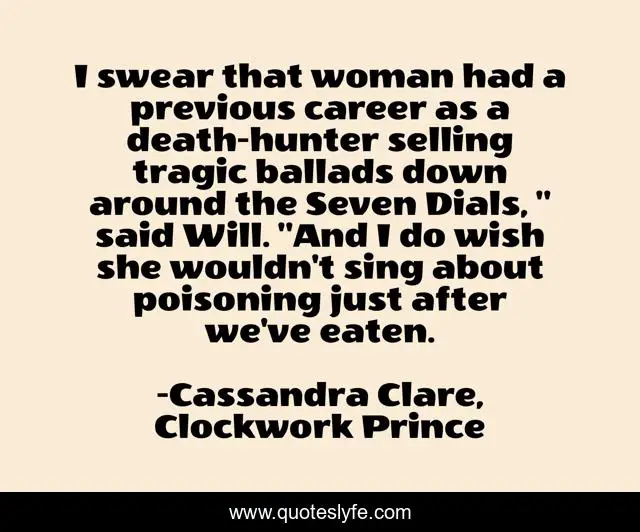 This page presents the quote "I swear that woman had a previous career as a death-hunter selling tragic ballads down around the Seven Dials, " said Will. "And I do wish she wouldn't sing about poisoning just after we've eaten.". Author of this quote is Cassandra Clare, Clockwork Prince. .