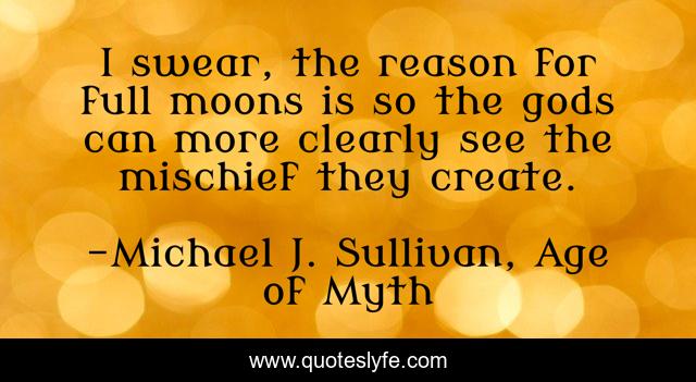 This page presents the quote "I swear, the reason for full moons is so the gods can more clearly see the mischief they create.". Author of this quote is Michael J. Sullivan, Age of Myth. This quote is about gods, full-moon, mischief, moon,.