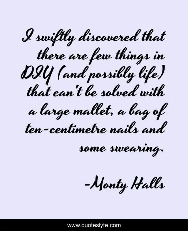This page presents the quote "I swiftly discovered that there are few things in DIY (and possibly life) that can't be solved with a large mallet, a bag of ten-centimetre nails and some swearing.". Author of this quote is Monty Halls. This quote is about diy, humour,.