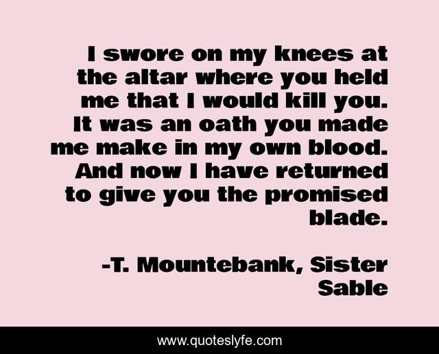 This page presents the quote "I swore on my knees at the altar where you held me that I would kill you. It was an oath you made me make in my own blood. And now I have returned to give you the promised blade.". Author of this quote is T. Mountebank, Sister Sable. This quote is about oaths-and-promises, revenge, oaths,.
