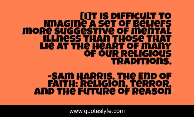 This page presents the quote "[I]t is difficult to imagine a set of beliefs more suggestive of mental illness than those that lie at the heart of many of our religious traditions.". Author of this quote is Sam Harris, The End of Faith: Religion, Terror, and the Future of Reason. This quote is about faith, belief, sam, delusion, religion, harris,.