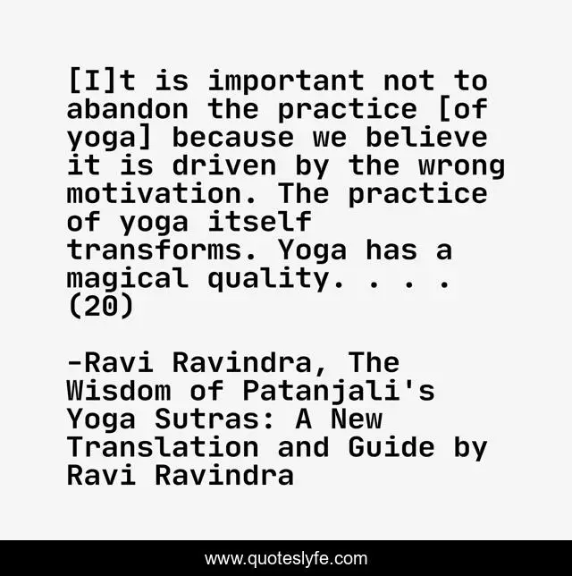 This page presents the quote "[I]t is important not to abandon the practice [of yoga] because we believe it is driven by the wrong motivation. The practice of yoga itself transforms. Yoga has a magical quality. . . . (20)". Author of this quote is Ravi Ravindra, The Wisdom of Patanjali's Yoga Sutras: A New Translation and Guide by Ravi Ravindra. This quote is about motivation, practice, yoga, transformation,.