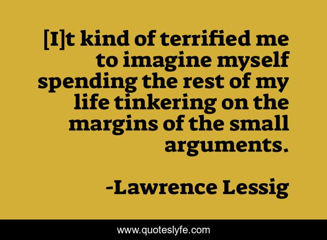 This page presents the quote "[I]t kind of terrified me to imagine myself spending the rest of my life tinkering on the margins of the small arguments.". Author of this quote is Lawrence Lessig. This quote is about life, government, money, political-campaigns, corruption, arguments, activity, politics, beliefs,.