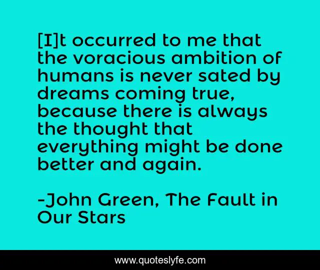 This page presents the quote "[I]t occurred to me that the voracious ambition of humans is never sated by dreams coming true, because there is always the thought that everything might be done better and again.". Author of this quote is John Green, The Fault in Our Stars. .