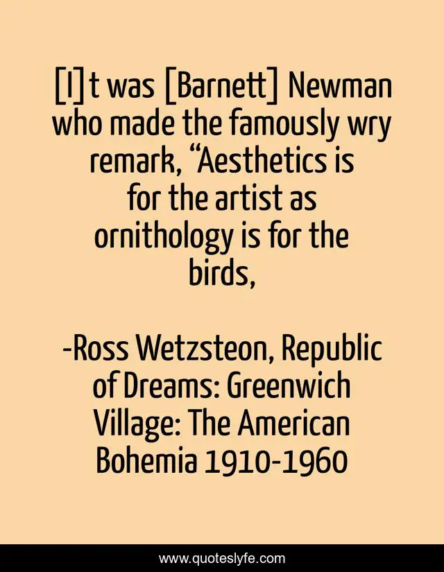 This page presents the quote "[I]t was [Barnett] Newman who made the famously wry remark, “Aesthetics is for the artist as ornithology is for the birds, ". Author of this quote is Ross Wetzsteon, Republic of Dreams: Greenwich Village: The American Bohemia 1910-1960. This quote is about barnett-newman, aesthetics, art, painting, artist,.